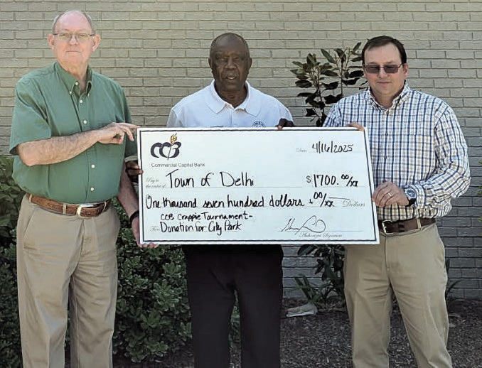 Commercial Capital Bank recenlty presented a check to the Town of Delhi to help pay for improvements at the Delhi City Park. The money was raised at the CCB Crappie Tournament earlier this year.Taking part in the presentation are, from left, CCB SEVP/Loan Officer Eddie Fuller, Delhi Mayor Jessie Washington and CCB CFO Jeremy Ledet.
